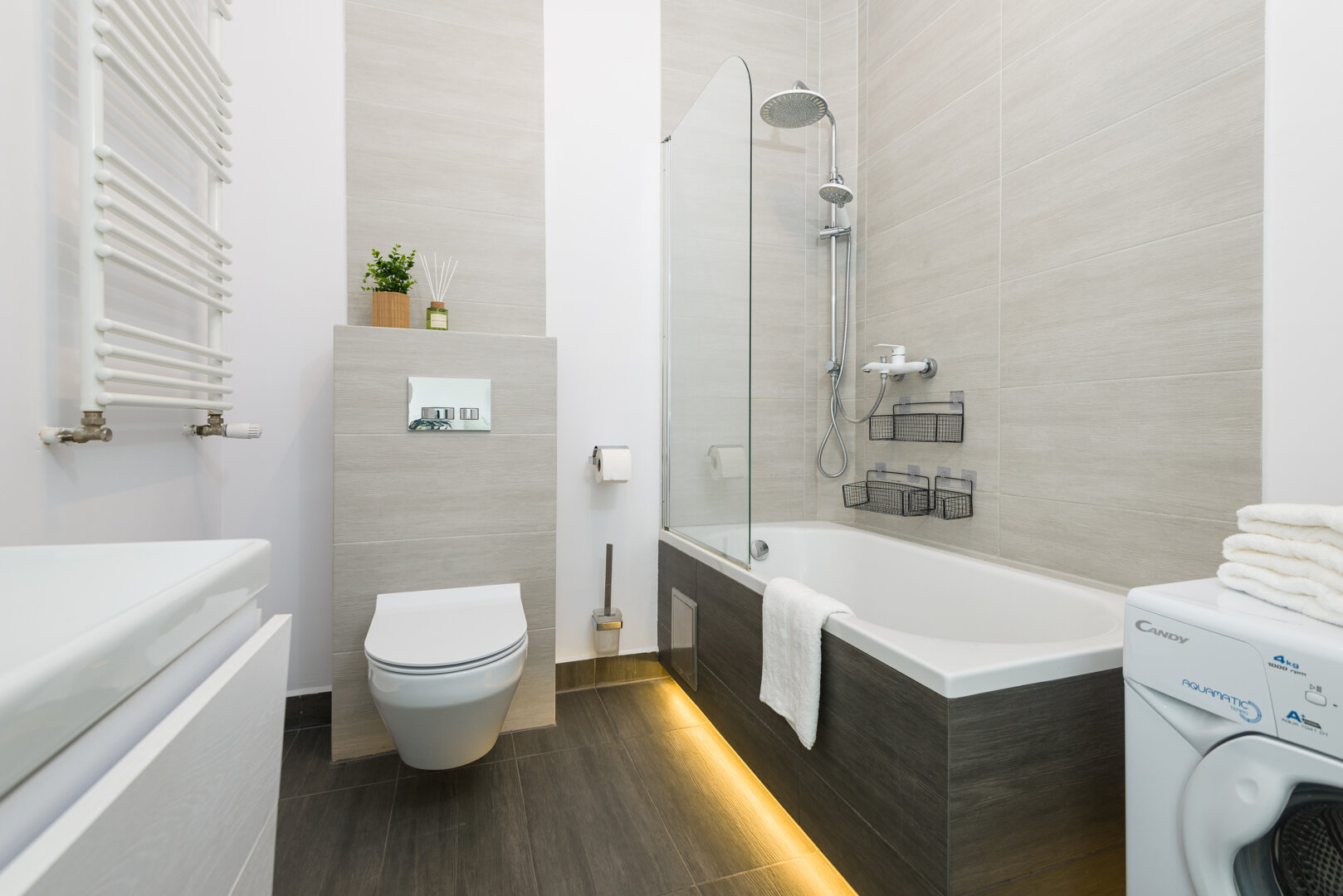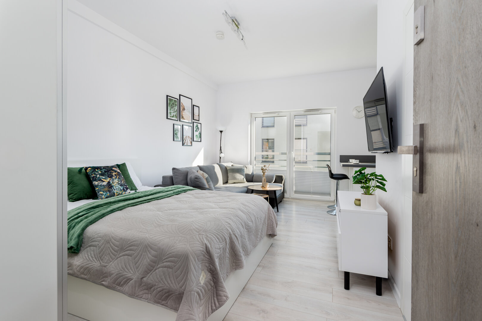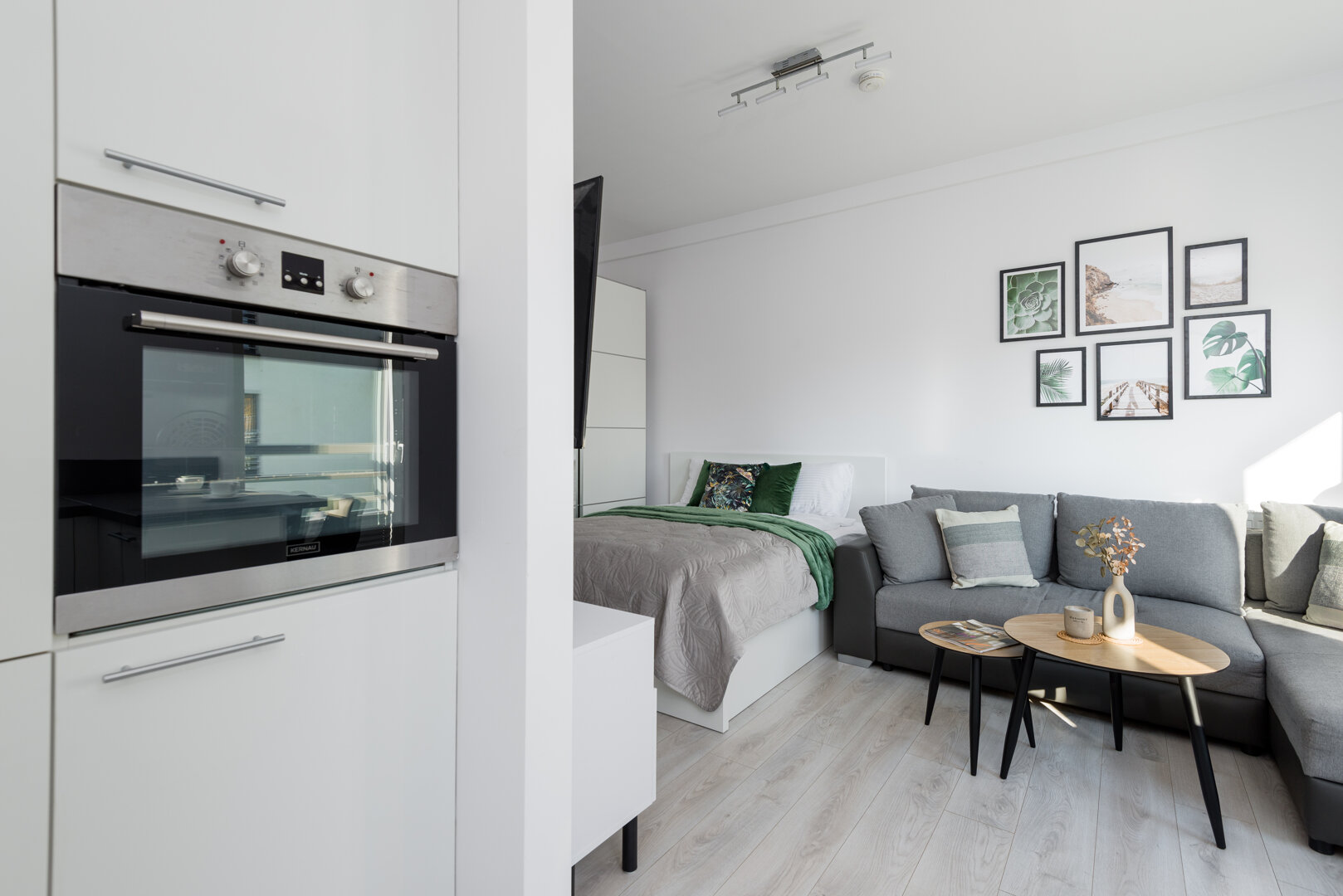 To nowoczesne mieszkanie o powierzchni 27,70 m² oferuje komfortowy pobyt w przestronnym salonie (17,24 m²), w pełni wyposażonej kuchni (4,34 m²) oraz eleganckiej łazience (6,12 m²), która łączy wannę z kabiną prysznicową, podświetleniem LED, oraz nowoczesnymi wykończeniami. Kuchnia została wyposażona w najwyższej klasy sprzęt AGD: lodówka w zabudowie, piekarnik, płyta ceramiczna oraz teleskopowy okap, a dodatkowe oświetlenie LED RGB pod szafkami wprowadza wyjątkowy klimat.